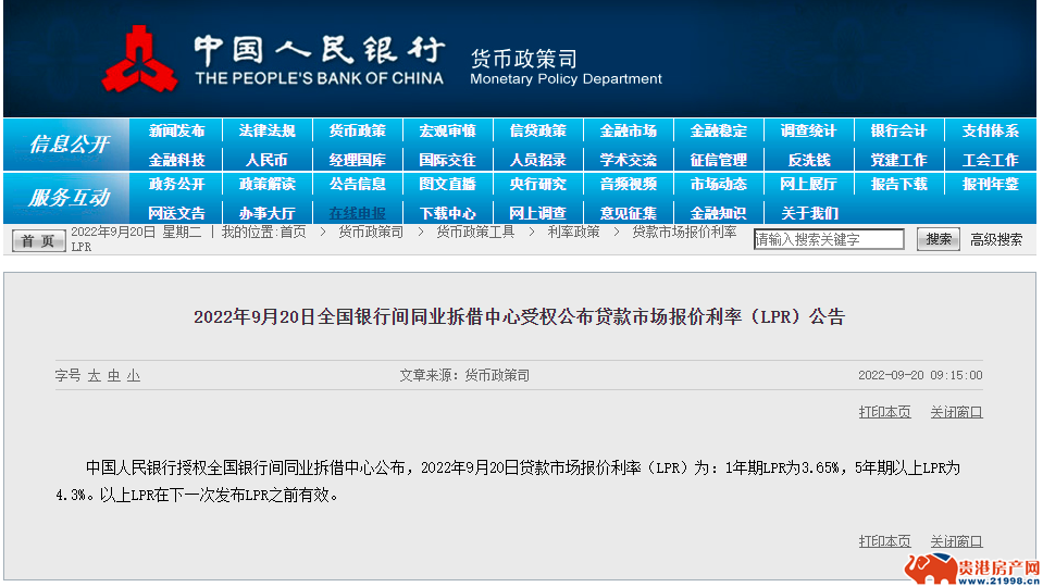 9月20日,中国人民银行授权全国银行间同业拆借中心公布最新贷款市场报价利率(LPR)。其中,1年期LPR为3.65%,5年期以上LPR为4.3%。